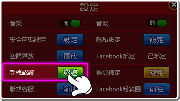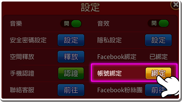 請玩家進入遊戲後至【設定】頁面進行綁定、認證以利於日後保障您自身權益。