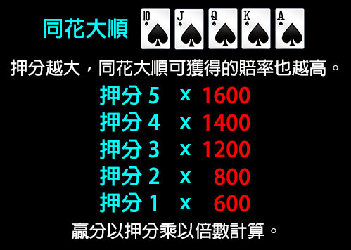 | 同花大順 | 最高1600 (參考特殊機制說明) |