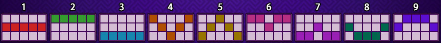9 條對獎線,由左至右或由右至左,連續出現 3 個以上相同圖案,即可中獎。