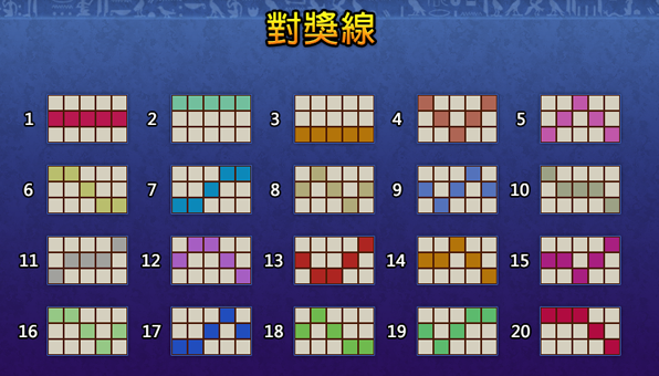 20 條對獎線,由左至右單邊對獎,連續出現 2 個以上相同圖案,即可中獎。