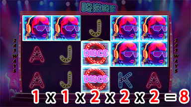 5 輪 243線,由左至右單邊對獎。贏分以押分除以 100 乘以倍數計算。