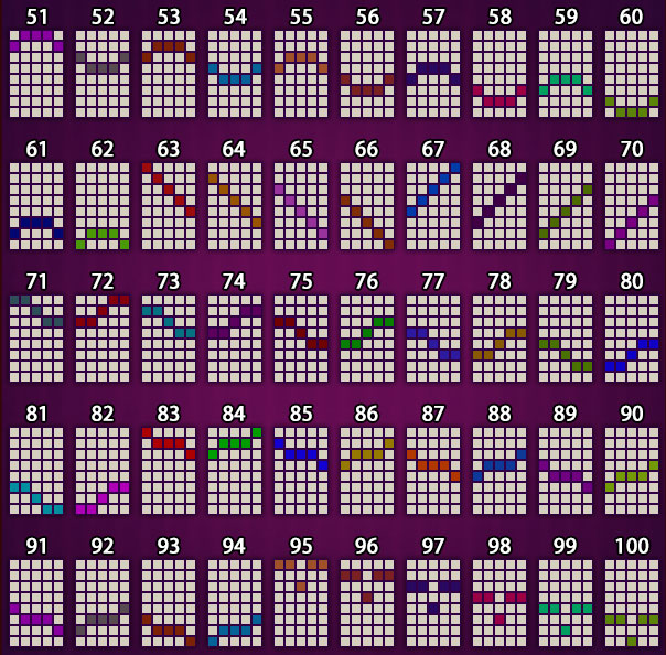 100 條對獎線,由左至右單邊對獎,連續出現 3 個以上相同圖案,即可中獎。