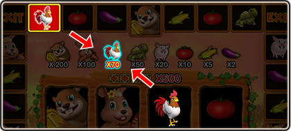 若中間出現多個相同圖案時,則可再乘以其出現次數。例如中間出現 3 個公雞,則贏分 = 總押分 x 70 x 3。