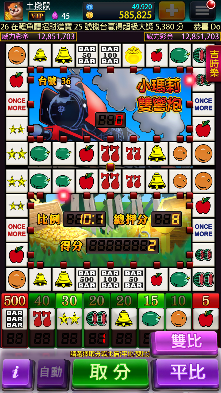 | 雙比 | 於主遊戲贏了100分,進行雙比時,再從角色身上資產額外取出 100分的等值遊戲幣進行比倍,一共投入200分進行比倍(原得分100分+資產100分),當資產不足以支付雙比所需金額,則只能進行平比或取分。 例如:小明在《小瑪莉雙響炮》押注中了100分,比倍玩法選擇「雙比」,系統再從角色身上額外取出100分的等值遊戲幣進行比倍,過關即獲得400分,若失敗除了損失100得分,會再從資產扣掉100分的等值遊戲幣。 |
