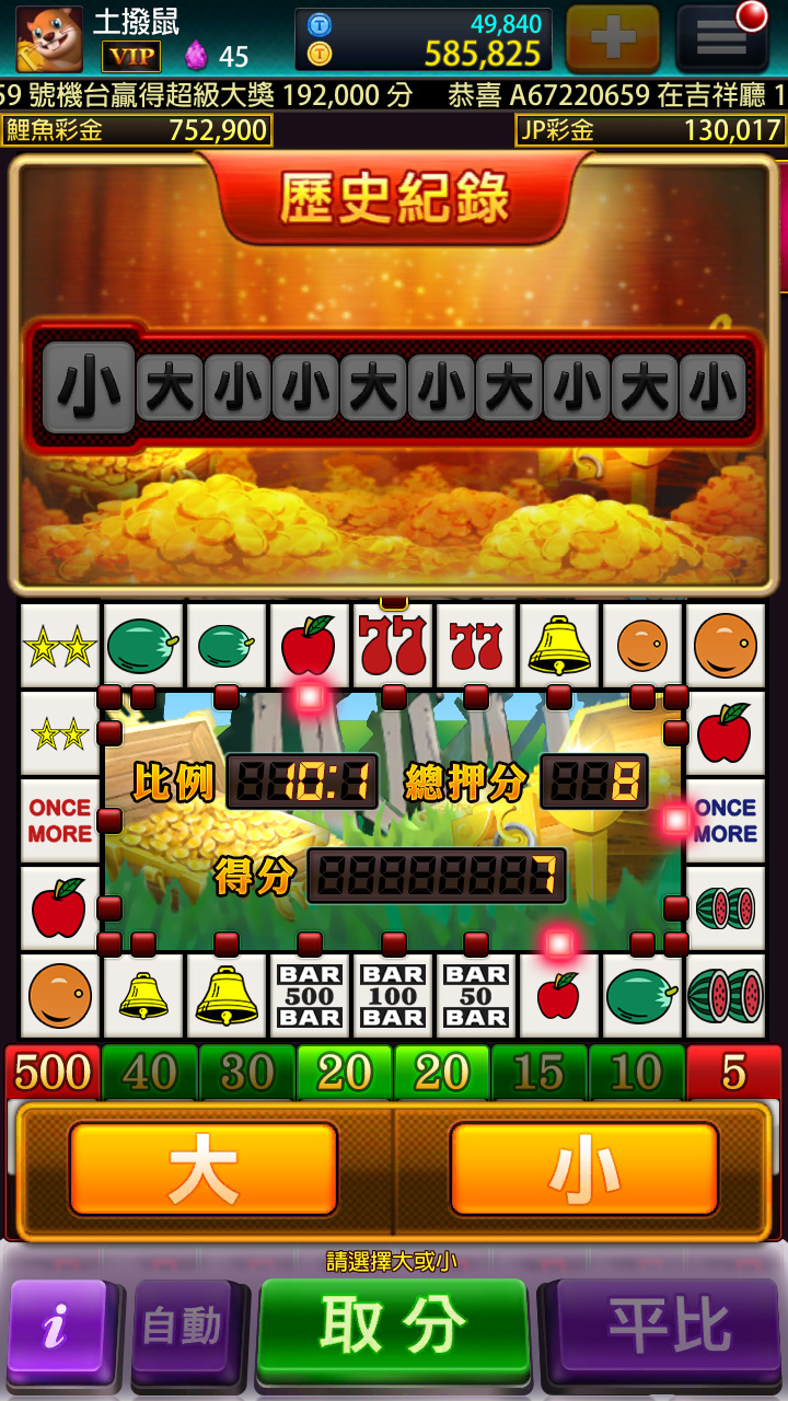 | 平比 | 以得分進行比倍,選擇大/小,過關即可獲得雙倍得分;失敗即失去得分。 |