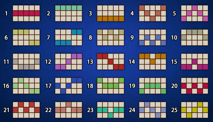 25 條對獎線,由左至右單邊對獎,連續出現 3 個以上相同圖案,即可中獎。