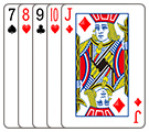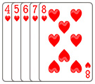 同花順 | 五張牌組成是順子且為同花色,但順子不是 10、J、Q、K、A ,若有兩個(以上)玩家為同花順,則比較最大的一張牌 (例如 K、Q、J、10、9 勝 Q、J、10、9、8 )。 |