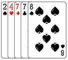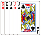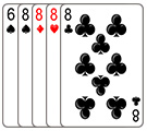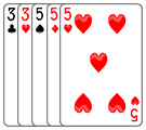 三條 | 三張相同數字的牌加上兩張互不相同的撲克牌。 若兩位以上的玩家持有三條,則三條數字最大者獲勝;若兩位玩家持有相同的三條,則比較第四張牌,第四張牌數字較大者獲勝。 |