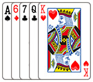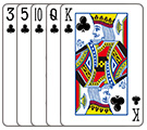 同花 | 五張牌為同一花色但並數字順序不連續。 若兩位以上的玩家持有同花,持有數字最大者獲勝;若兩位玩家持有相同的最大單張數字相同,則比較第二大張的牌,並依此類推。 |