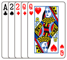 兩對 | 兩個不同的對子加上任一單張。 若兩位以上的玩家持有兩對,則擁有較大對子者獲勝;若兩位玩家持有的較大對子相同,則比較次大的對子;若兩位玩家持有的兩個對子皆相同,則由持有之單張較大者獲勝。 |