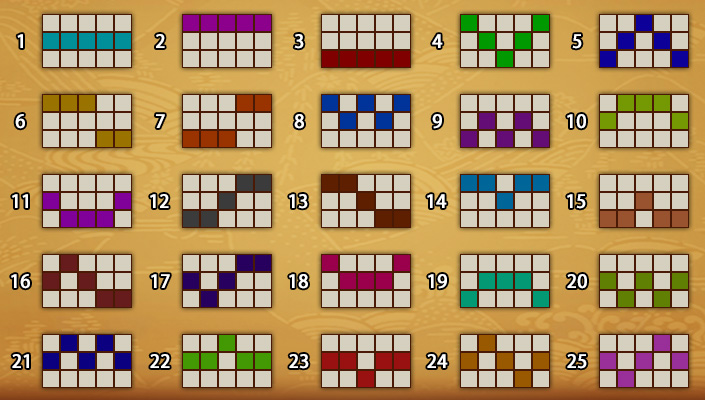 ◆ 25 條對獎線,由左至右單邊對獎,連續出現 3 個以上相同圖案,即可中獎。