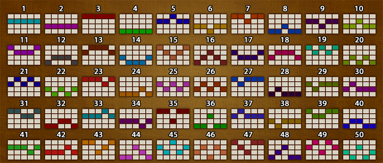 50 條對獎線,由左至右單邊對獎,連續出現 3 個以上相同圖案,即可中獎。