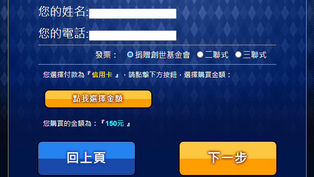 請填寫基本資料及選擇欲購買之金額,並按「下一步」。