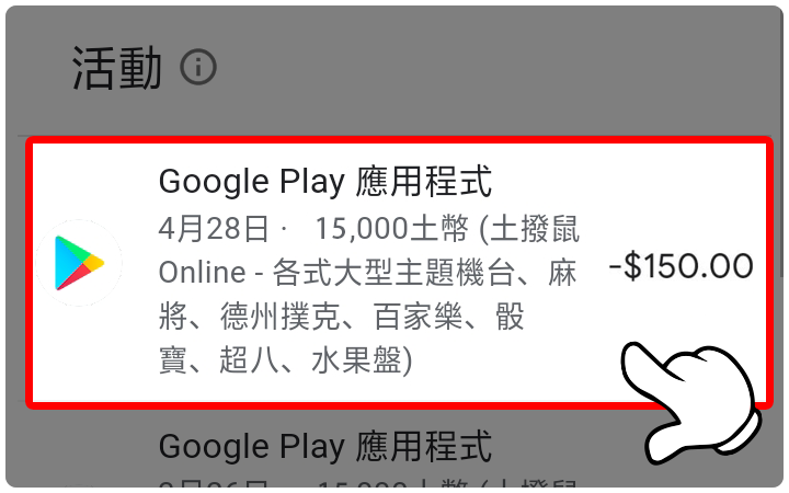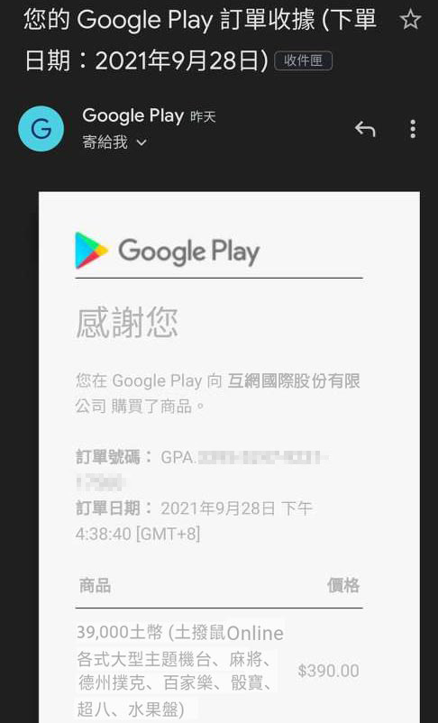 ※當您使用Google Play儲值時發生儲值未到帳之問題,請提供帳單明細截圖「步驟八」的