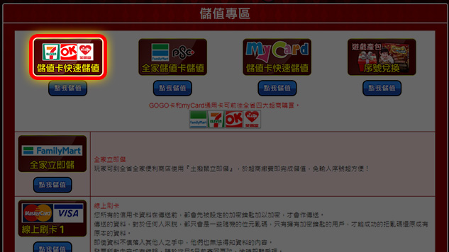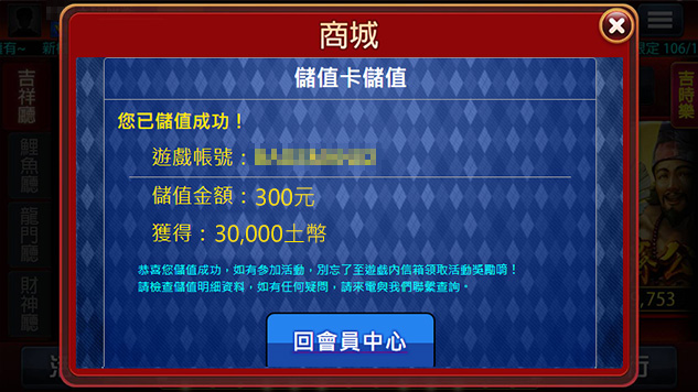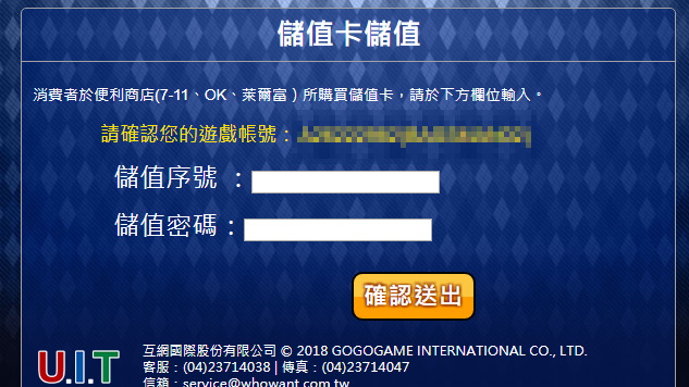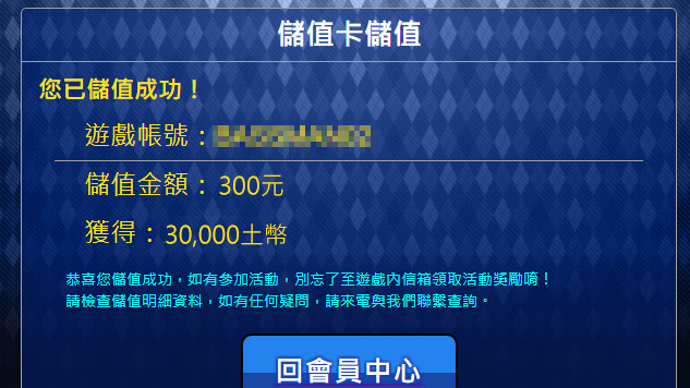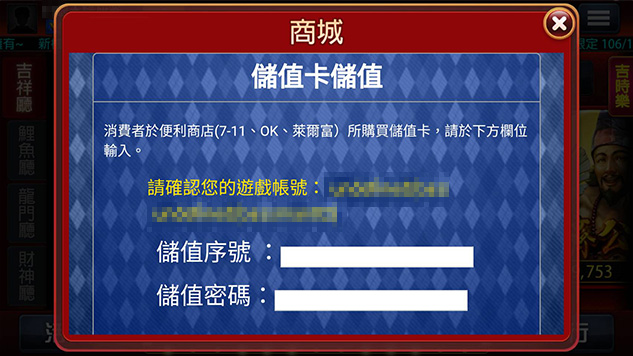 輸入您所購買的儲值序號和密碼,點數將儲值到您登入的遊戲帳號。