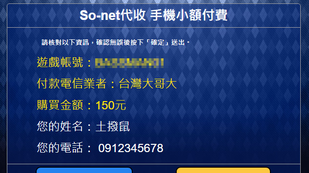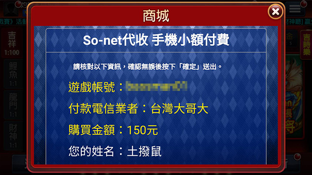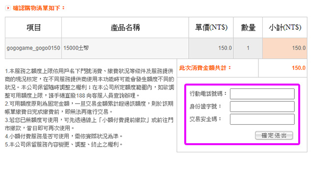 再次確認要儲值的遊戲帳號、付款方式及購買金額。