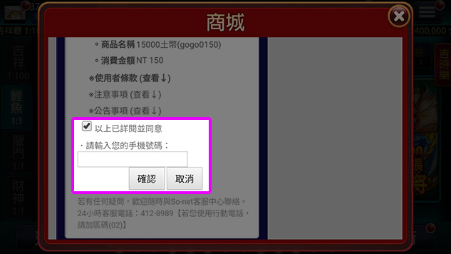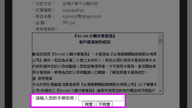輸入手機號碼並【同意】小額付費條款。