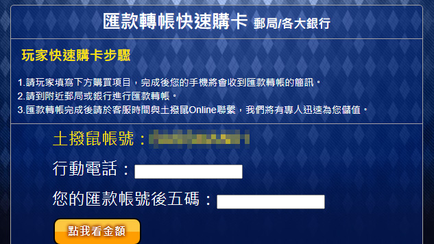 確認遊戲帳號,並填寫購買項目,完成後您的手機將會收到匯款轉帳的簡訊。